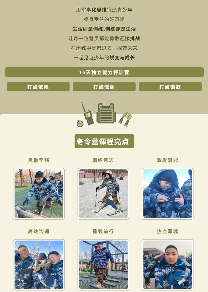 (一)家长须知: 1.告知孩子在军营注意安全、遵守军营纪律、爱护公物、听从教官指挥,勇敢坚强认真锻炼,我们与您同步,共同见证他们的成长。 2.孩子需要带的个人生活用品:水杯、牙膏,牙刷,漱口杯,毛巾,拖鞋,运动鞋1双,香皂,洗衣粉,内衣裤1-2套、换洗衣服1套、文具、腰带、自身带的药品(指已有不适但不严重)、护肤品等。 3.严禁携带手机、电话手表、平板、游戏机等相关电子产品、笔记本电脑,管制刀具或者易燃、易爆等危险物品,零食零花钱,首饰等贵重物品,遗失自己负责,(训练期间需上英语训练课的学员可以申请携带:电脑、平板、和耳机,但必须交由老师保管),谢谢家长的支持和配合; 4.所带书籍和作业,请家长仔细检查; (二)入营温馨提示: 1.无疾病,年满6—16周岁,身体健康的青少年儿童均可报名; 2.所有参加训练营的学员免费配送营服装一套;训练现场营员不得破坏训练器材及现场设施,破坏公共财产原价赔偿。